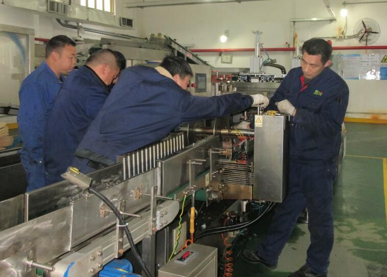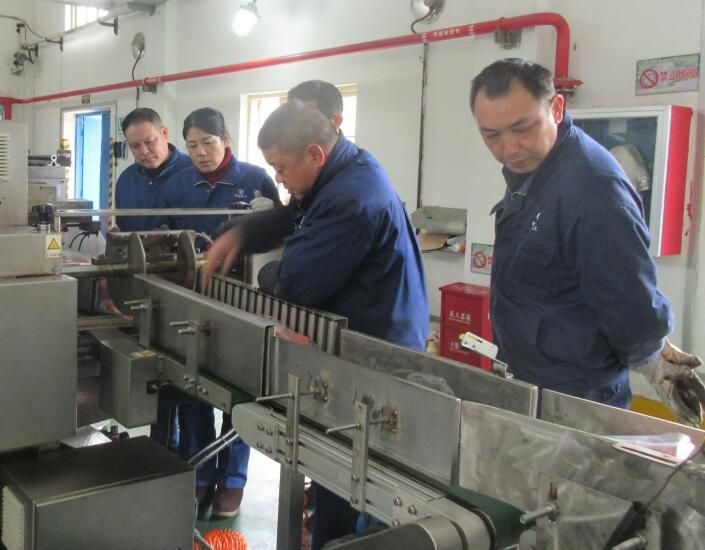 2019年2月22日,包裝設(shè)備提供方武漢人天公司相關(guān)設(shè)備陸續(xù)運(yùn)送至公司。當(dāng)天晚上1號(hào)生產(chǎn)線一停產(chǎn),生產(chǎn)部檢修班的師傅們就連夜加班加點(diǎn)工作,完成了生產(chǎn)線原有的各設(shè)備拆除工作,并將新設(shè)備運(yùn)送至104工房。